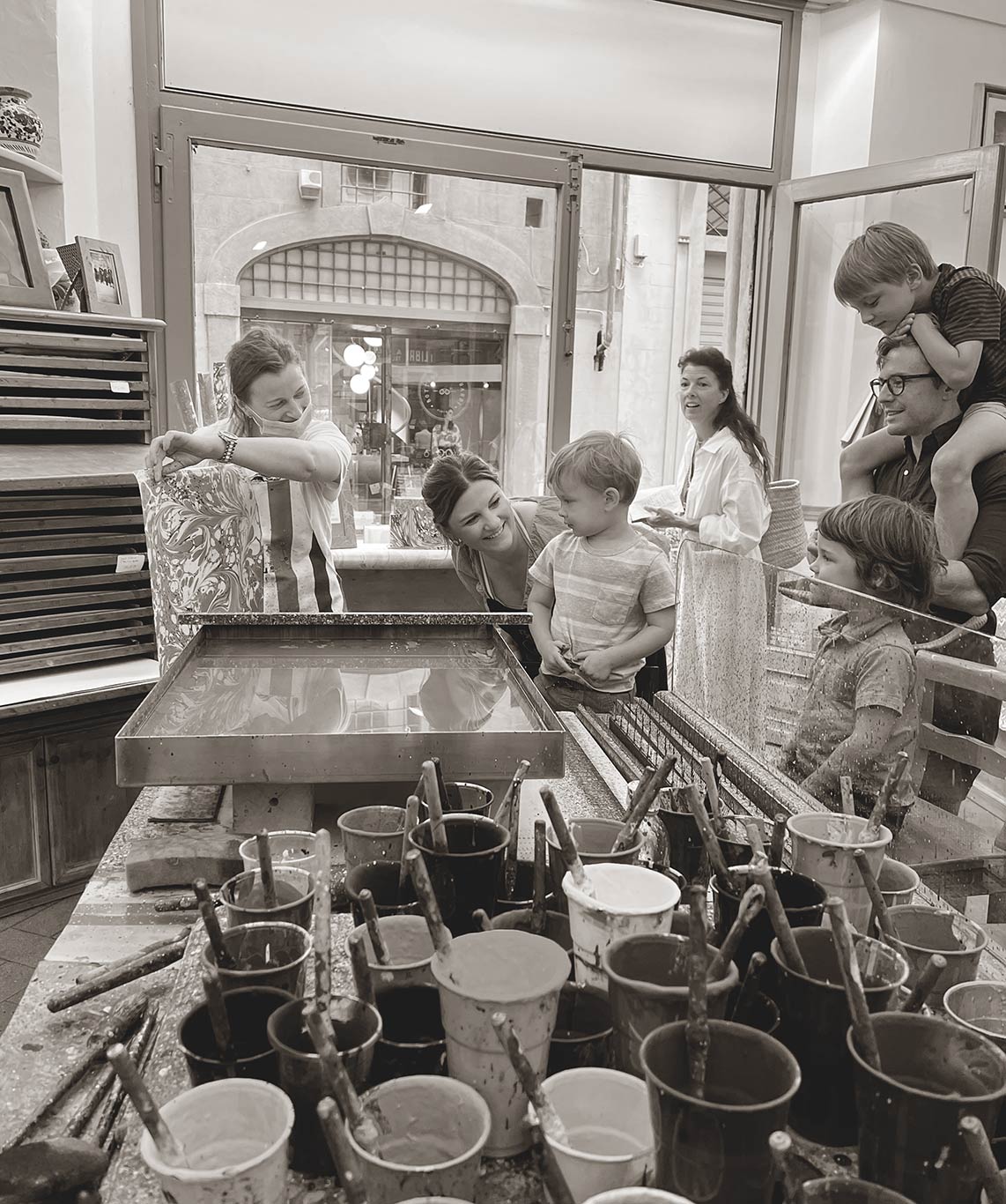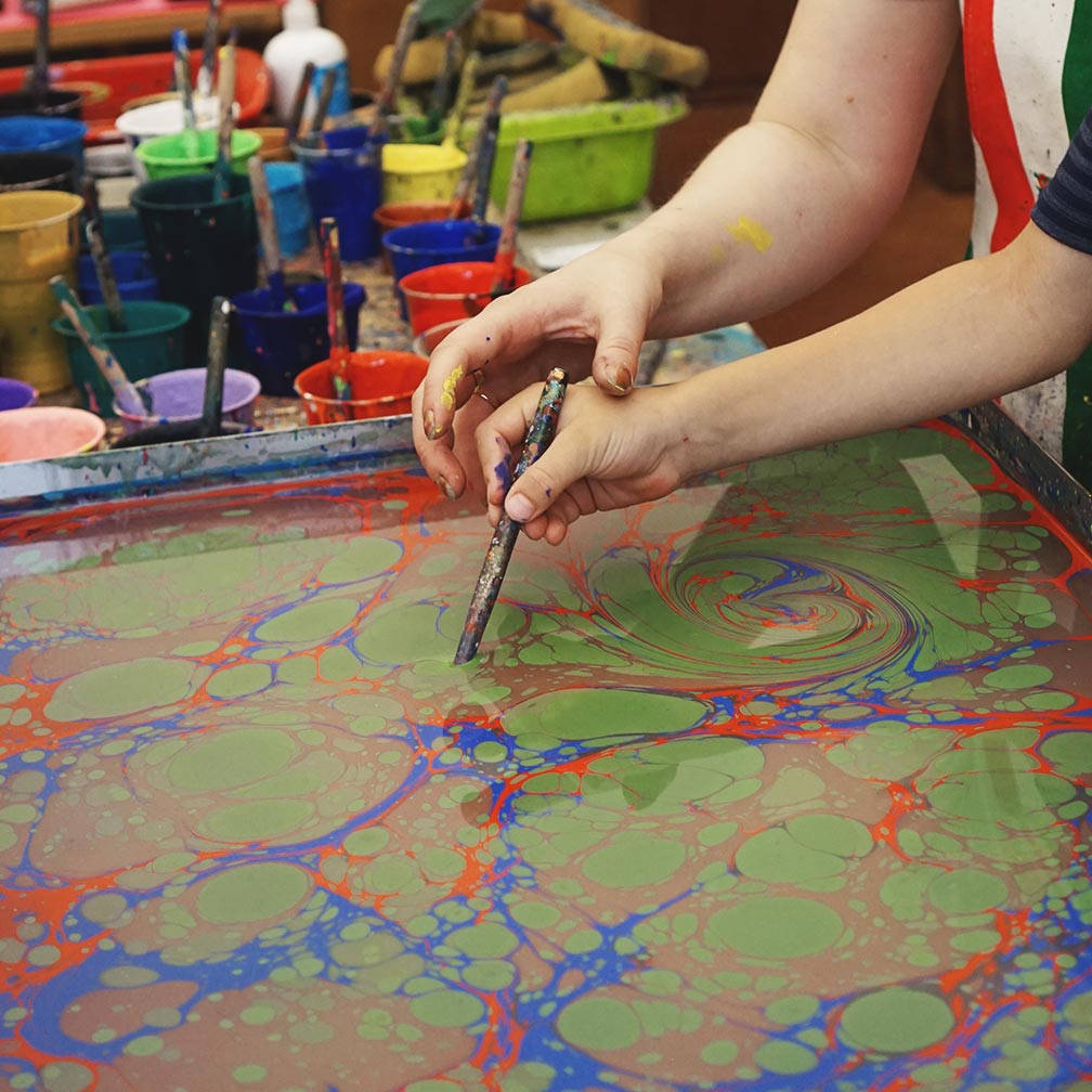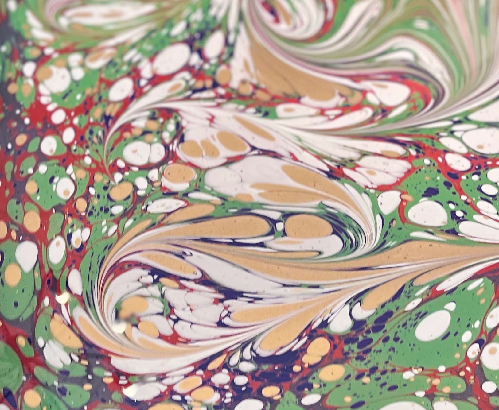 Marbled paper is a tradition in Florence dating back to the 16th century. Paint is sprinkled over a plant-based gel, and the colors are swirled together to create unique patterns and shapes. Paper is carefully applied on top, picking up the pattern.
